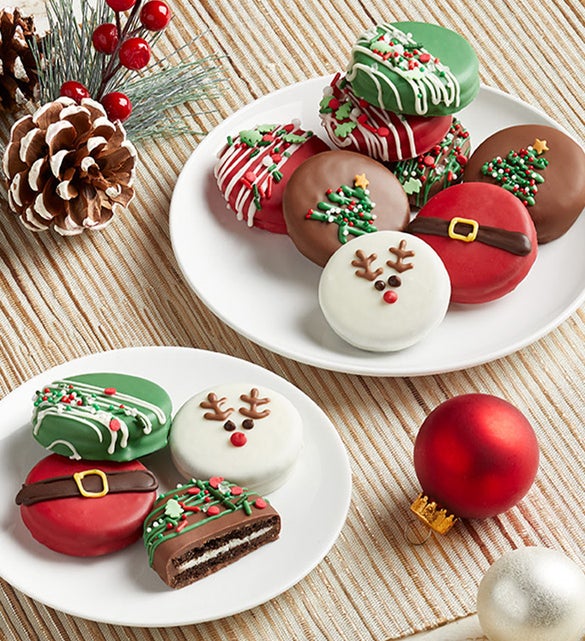 With Christmas in your heart send a favorite someone a holiday goodie box filled with twelve or six festively fun and merry OREO® cookies. These delicious treats are covered in creamy chocolate and decorated as red Santa belt, white Reindeer, milk chocolate Christmas tree and Christmas sprinkles. First they’ll smile, and then they’ll bite into the deliciousness beneath the creamy covering and taste the chocolate cookie goodness and sweet cream of a classic OREO® cookie. Season’s Greetings just got a whole lot sweeter!